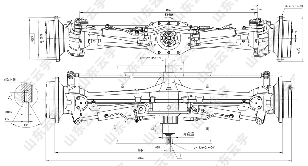 ● Two-stage decelerating structure is adopted for steeringdrive axle.universal joint rotating at constant angular velocity is adopted to connet the inner semi shaft withthe drive shaft.with the drive shaft. ● Integral-type ductile-iron axle housing with adequaterigidity and light weight is adopted. ● Centrally positioned transmission shaft and swing-typecentral swing pin are adopted. ● Front-wheel steering solely under hydraulic pressure,the steering angle can reach 50°. ● Suitable for 120 horsepower four-wheel drive tractorand similar products. |