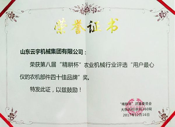 The 8th "Intensive Cultivation Cup" Agricultural Machinery Industry Certificate of "40 Best Brands of Agricultural Machinery Components Users Most Desired"