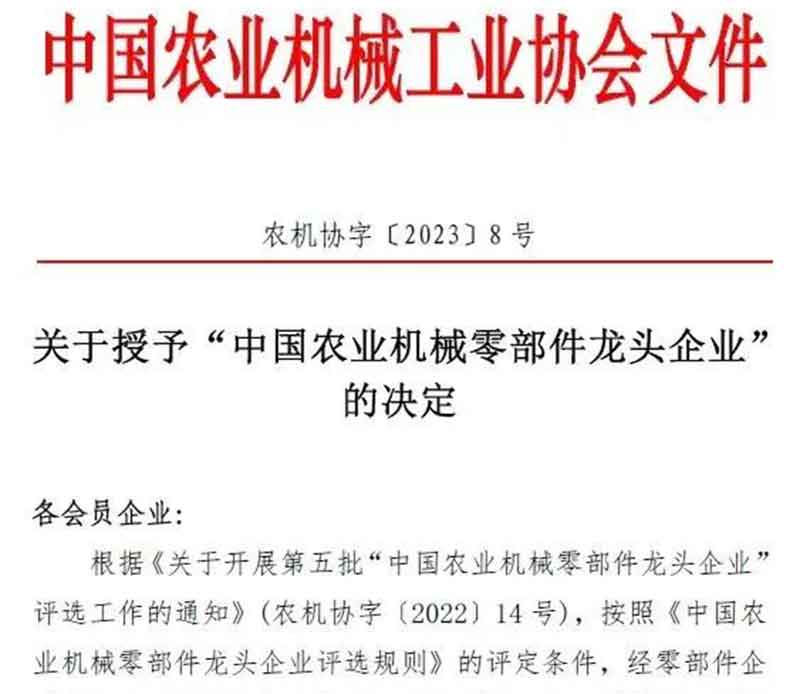 2023年3月9日,中国农业机械工业协会印发农机协字(2023)第8号文件,授予yl23411永利集团公司“中国农业机械零部件龙头企业”光荣称号。 详细>>