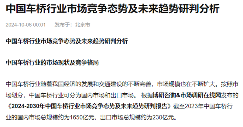 中国车桥行业随着我国经济的发展和交通建设的不断完善,市场规模也在不断扩大。按照市场划分,中国车桥行业可分为国内市场和出口市场。 根据博研咨询&市场调研在线网发布的《2024-2030年中国车... 详细>>