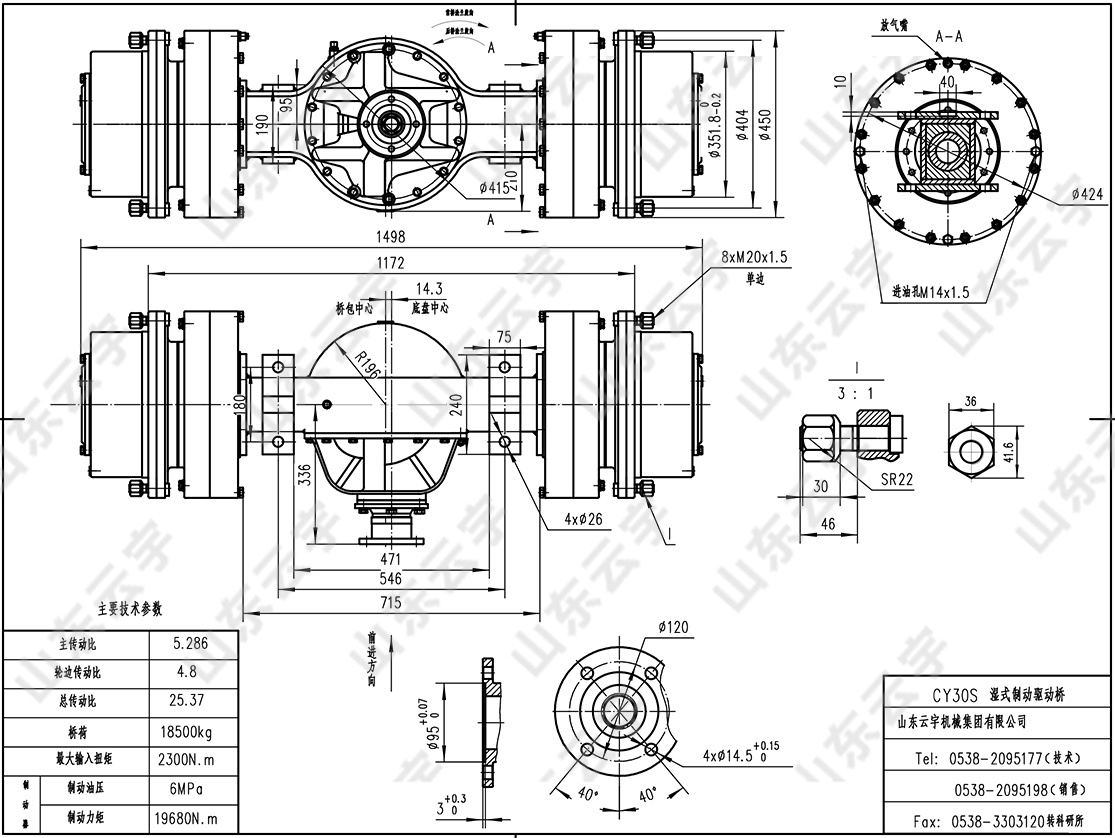 ● 采用两级减速传动机构,即螺旋锥齿轮减速和轮边行星减速机构,输入扭矩大,传动效率高。