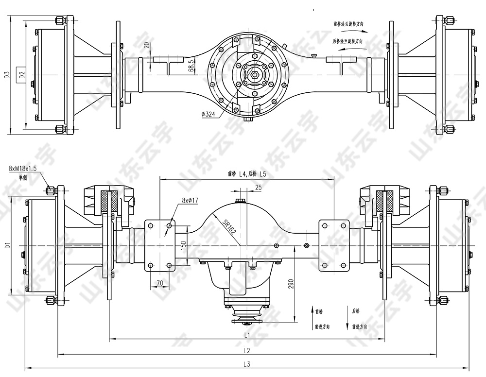 结构尺寸说明: 1. ZL16E驱动桥输入法兰的旋向与图示相反。 2. ZL16E轮辋螺母规格为M20×1.5,对边S=30,SR22,其余尺寸如图所示。 3. ZL16E驱动桥的安装盘为双盘,安装孔尺寸为973/150×65,安装盘厚度为137,其余尺寸如图所示。 |